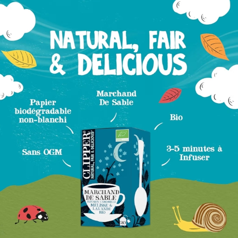 INFUSION CLIPPER BIO POUR SE RELAXER : Parfaite pour boire durant vos moments de relaxation avant le coucher, l'infusion bio "Marchand de Sable" de Clipper vous accompagne délicieusement en fin de journée.
